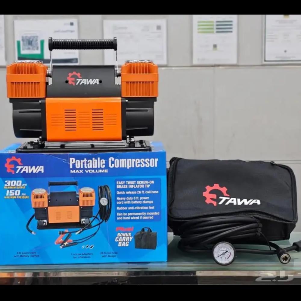🔸 كمبروسر TAWA هو رفيقك الموثوق في أي طريق، بقوة تضخ 300 لتر هواء في الدقيقة وضغط يصل 150 PSI.